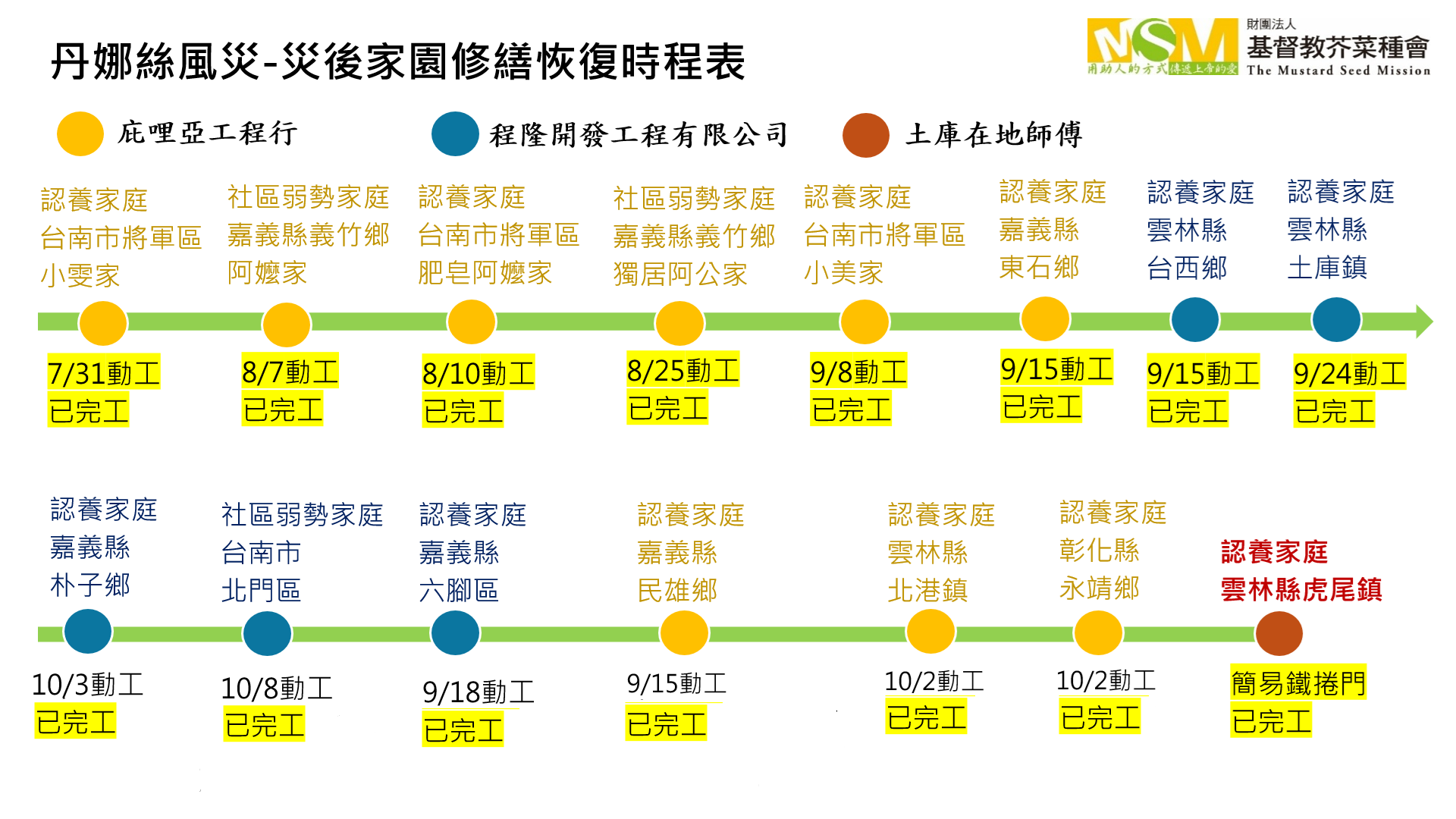 當7月6日丹娜絲颱風重創中南部時,無數家庭在一夜之間失去了遮風避雨的依靠。面對突如其來的災難,基督教芥菜種會立即深入災區,送上急難救助金與生活物資,並於7月底展開修繕行動,陪伴受災家庭,一步步重建家的安全與希望。
