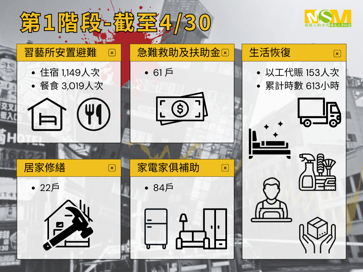 一場大地震,對花蓮主體觀光業服務業產生巨大影響,受災居民與弱勢家庭除了居住環境急需修繕外,同時面臨更大的經濟問題,因旅遊景點受地震影響,許多業者紛紛停業,在山上工作的林大姐因此面臨失業,家裡有兩個孩子在讀書、每月需要償還的貸款,讓她開始擔心未來一家人的生計