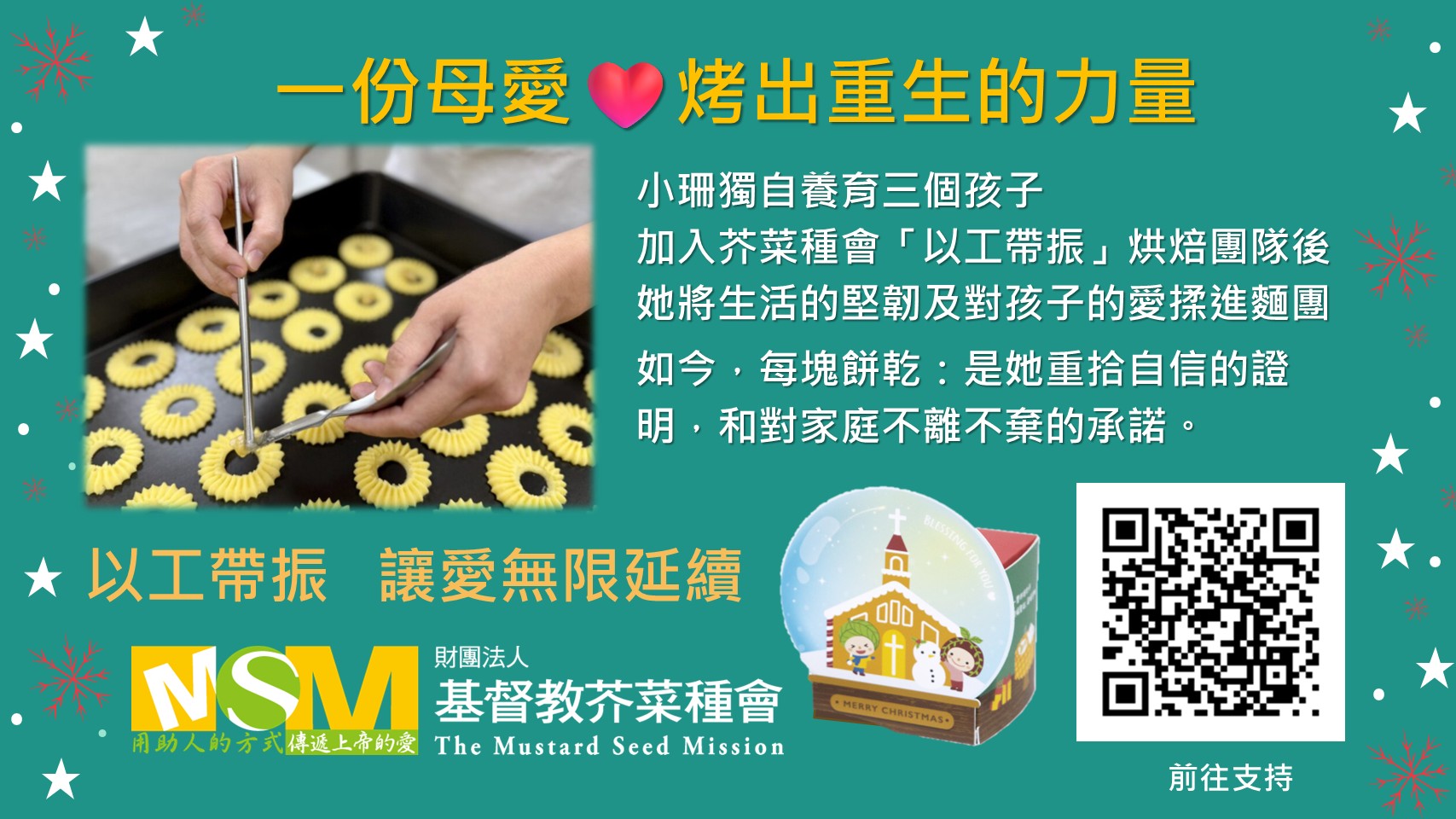 因著社工的介紹,小珊加入芥菜種會「以工帶振」計畫,在烘焙課程中學習、工作,一點一滴重新找回自信。從中秋月餅到聖誕餅乾,每一次揉麵、塑形、包裝,都像在重新拼起生活的力量。