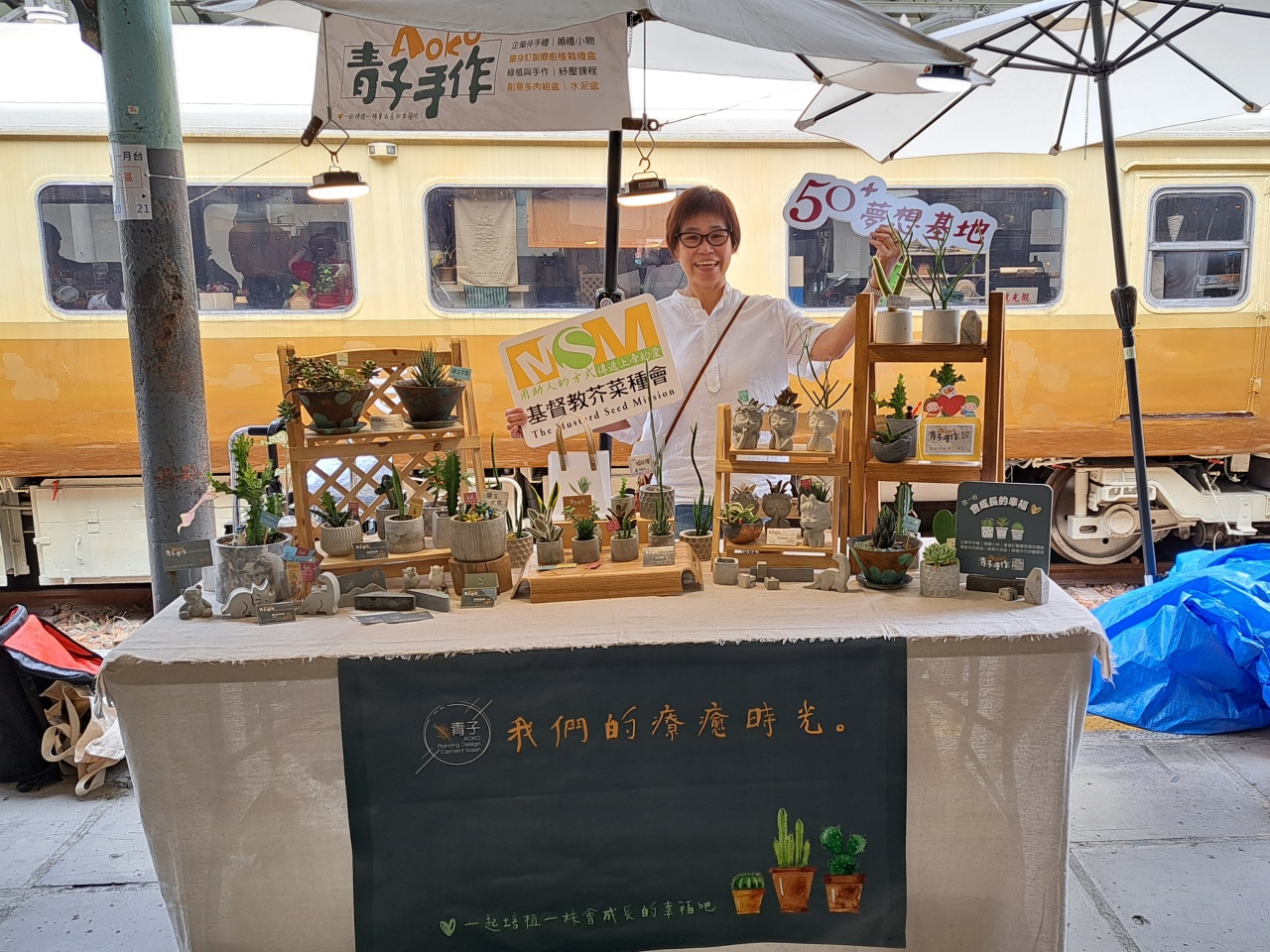 學員小輕(化名)從事設計工作三十年,享受其中的樂趣與幸福感,年紀雖然漸長,仍沒有失去對它的熱情,但日漸嚴重的老花,已不適合從事長時間坐著、面對電腦的工作,對職涯發展開始出現危機感。她在減少接案的半退休狀態下,又因疫情期間減少外出,將多出的時間,投入喜歡的種植興趣,雖遇到許多同好,但是透過網路分享、交流種植經驗的方式,卻不是那麼實際(無法深入交流,也未能有份收入)。後來透過「中彰投區銀髮人才資源中心」轉介,知道本會有辦理市集熟齡培力,於是起心動念到市集擺攤~在課程中,我們與「小旅市集」公益合作,安排學員們一起去市集進行品牌實戰,而小輕因著努力與積極,在結訓後仍持續投入市集銷售,甚至有機會在雙十活動的特殊區域設攤。她覺得自己很幸運,能把熱愛的興趣轉化成退休後的再創業(轉職)。她提到近期的心境「一天為何只有24小時?為何我會需要睡覺呢?很久沒有這樣的感受了~」。