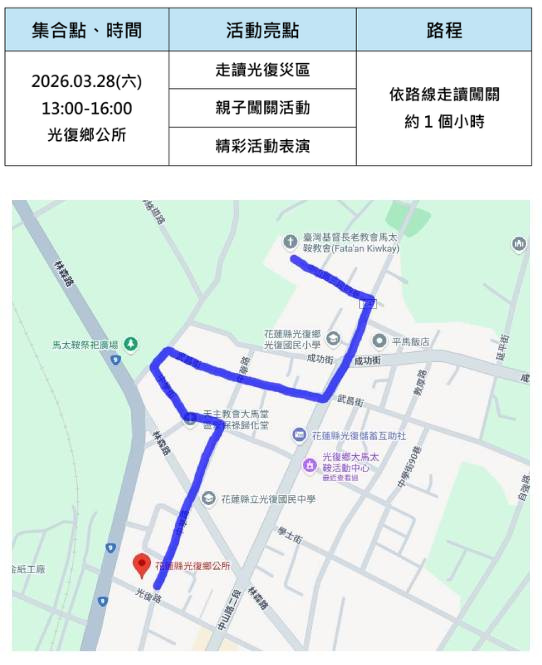 3/28(六)下午,邀請您帶上家人,用行動陪伴花蓮光復的脆弱家庭,透過親子公益健走,陪光復家庭走復原的「最後一哩路」!