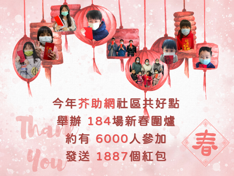 疫情持續了三年,社區中的大小成員能平平安安一起吃團圓飯,享受得來不易的溫馨氣氛,這都要感謝社會大眾和愛心企業的支持,讓芥菜種會與社區夥伴能攜手為認養家庭舉辦「新春圍爐」,為孩子送上象徵「平安」「健康」的紅包,也讓團圓飯備感溫馨。